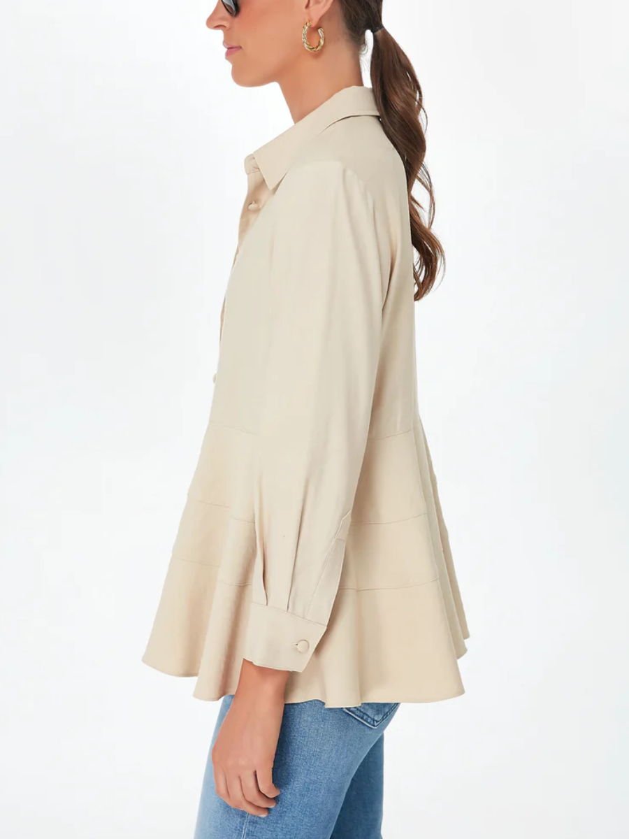 Your traditional button down with a twist, the Ashlen Blouse is the easiest piece that you need to update any look. With covered buttons that add a dash of tailored class, this subtle fit-and-flare number is designed with a tiered hem that makes it stand out in an all-over creamy colorway that pairs well with everything. From denim to trousers, heels to sneakers, work to play, this year-round top does it all and will have you looking your best with just a few classic touches.