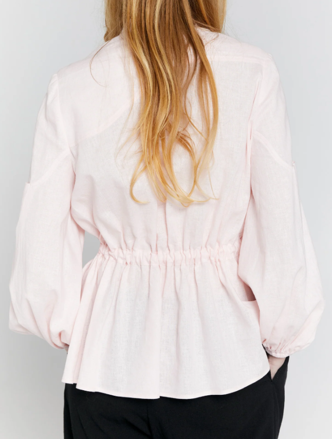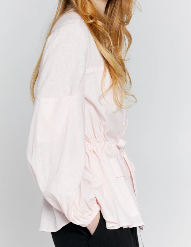 Explore a fresh take on utility chic with the shirt, available in versatile shades of black, pale pink, and herb green. This shirt features a button-down front, cargo-style pockets, and elegant ballooned sleeves, all tailored to cinch at the waist for a flattering silhouette. Hidden pockets are cleverly integrated within panelling at the waist and on the sleeves, enhancing the shirt's functionality while maintaining a sleek look.