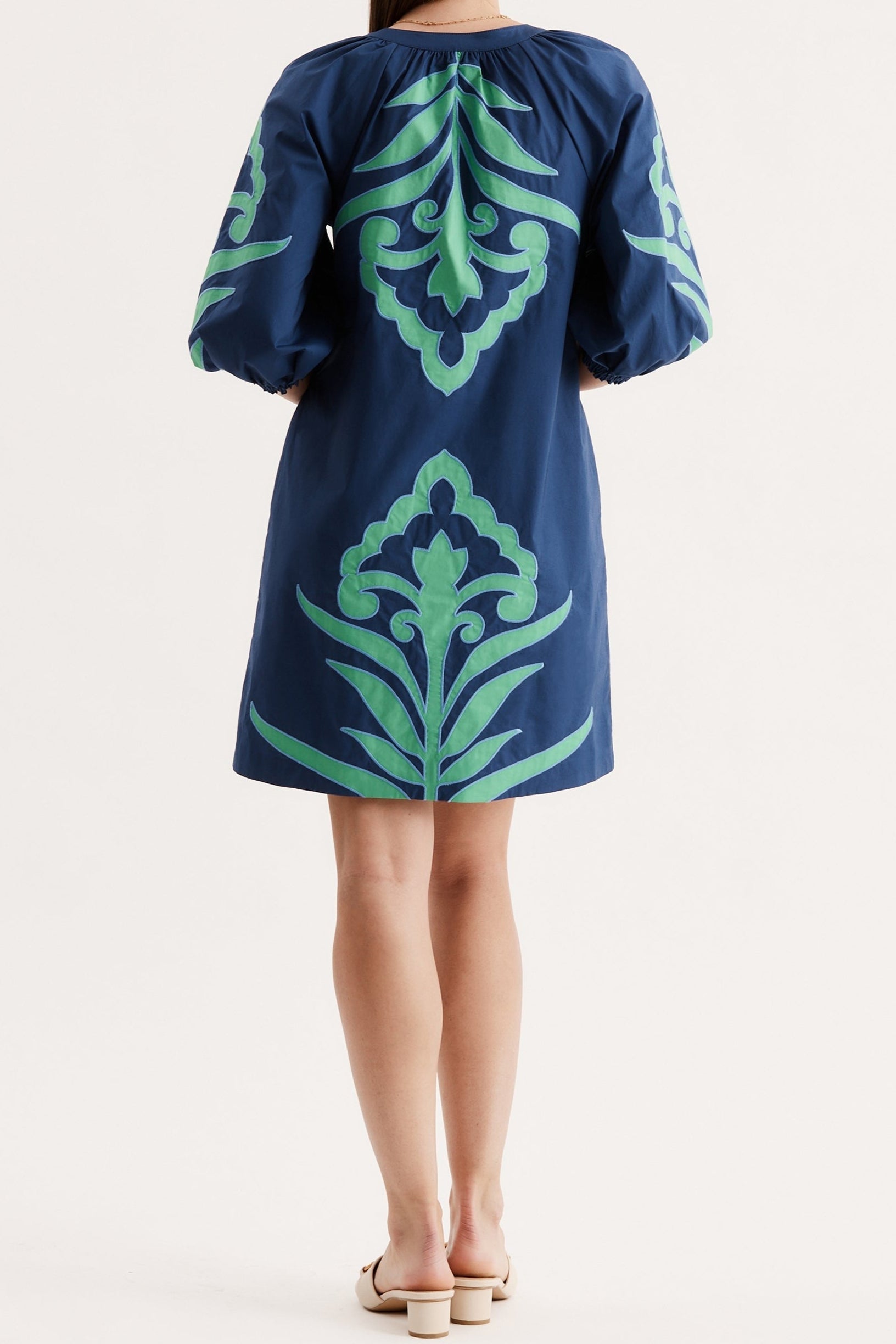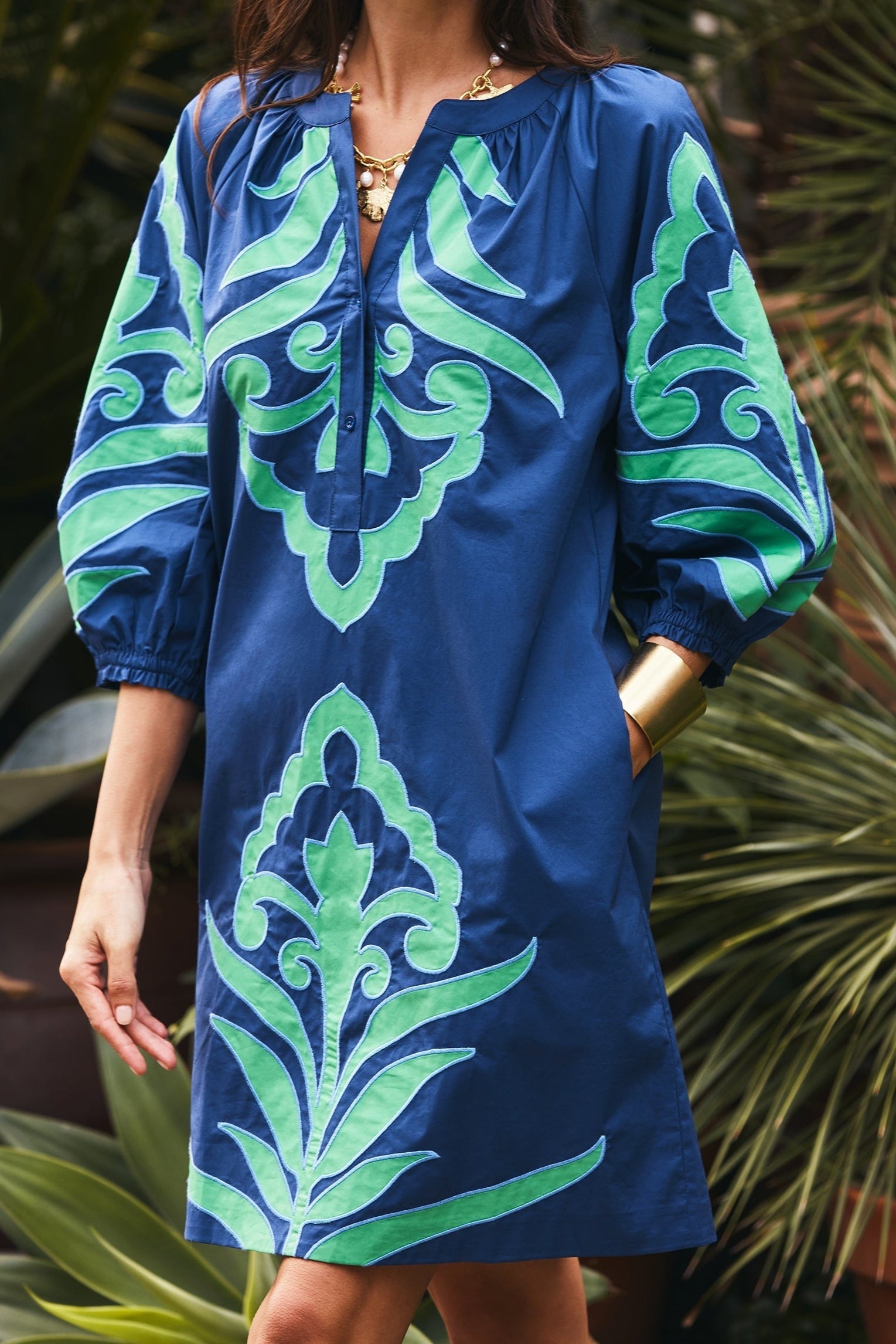 We've taken a classic shift dress and gave it a timeless twist - gorgeous emerald green appliqué in a floral motif along the front, back and side of this piece make it instantly elevated. Pockets and a notch front placket make it an easy-to-wear style that stands out.