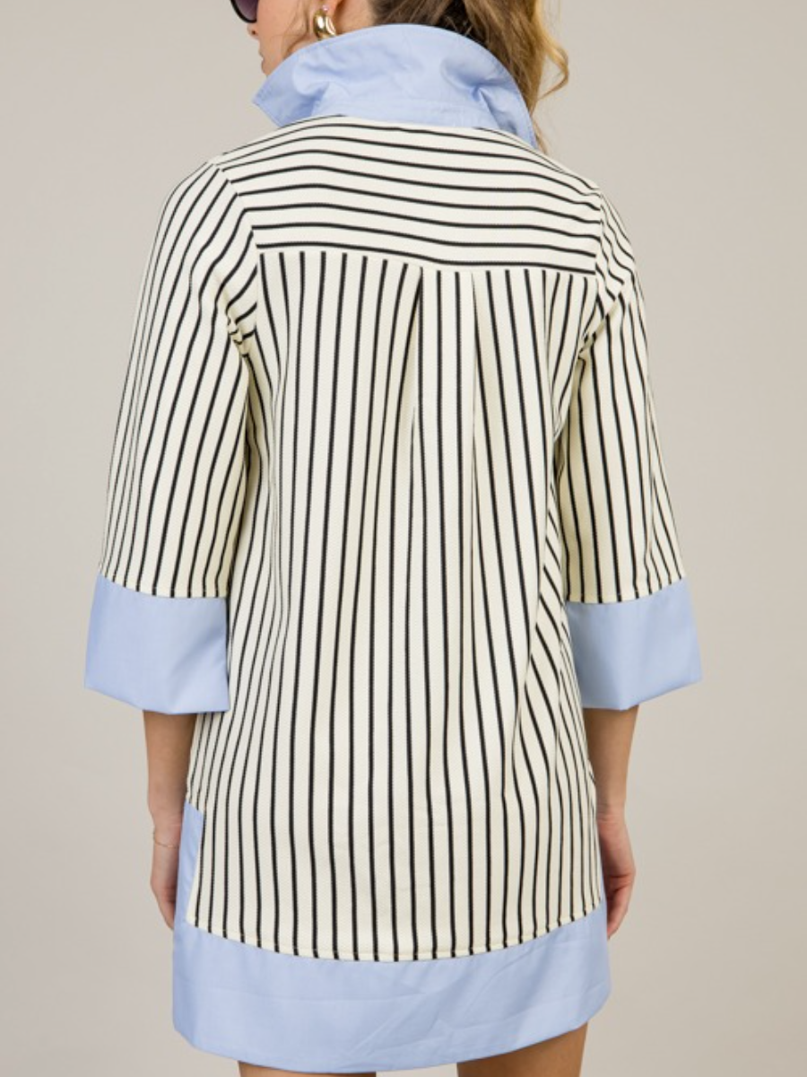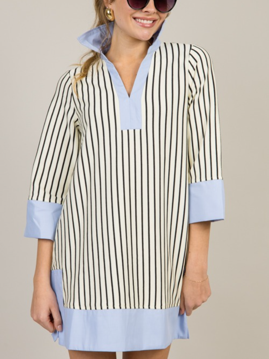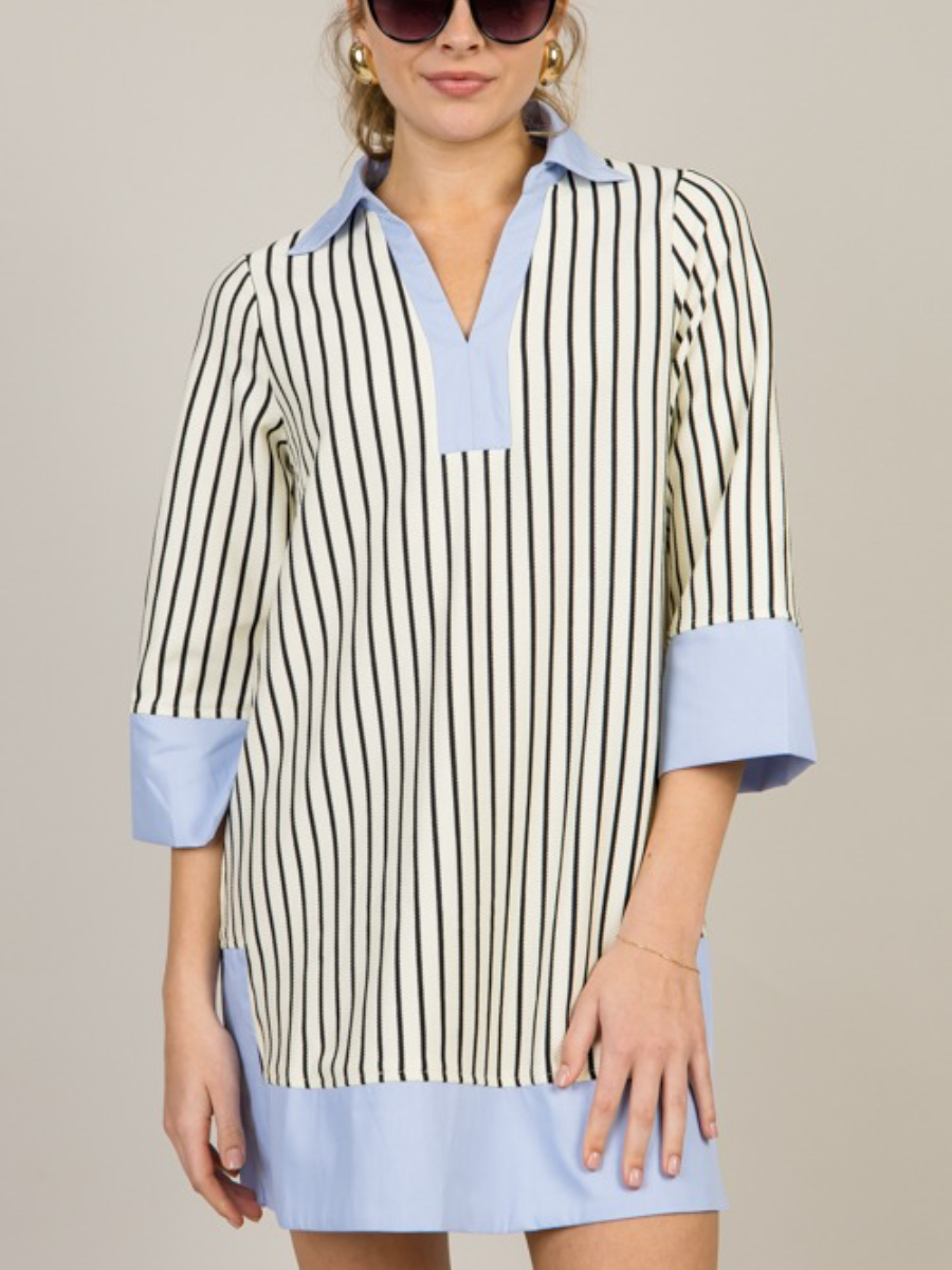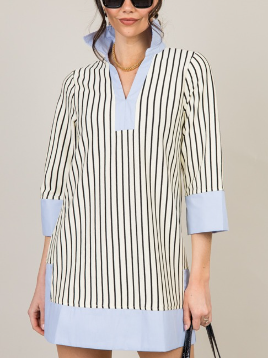 Y'all this dress is so good. It has a chic, high-end look at an affordable price point that makes us love it that much more! The cream and black body is crafted from a knit stretch fabric with a solid blue woven contrast trim that elevates the look.