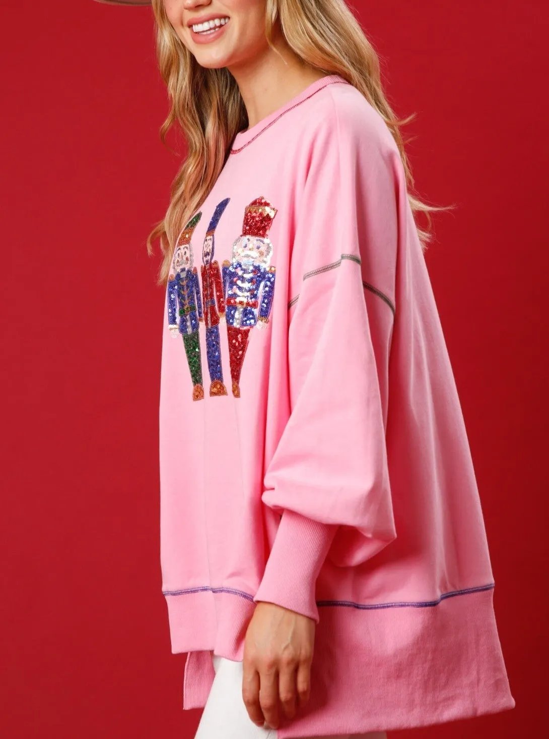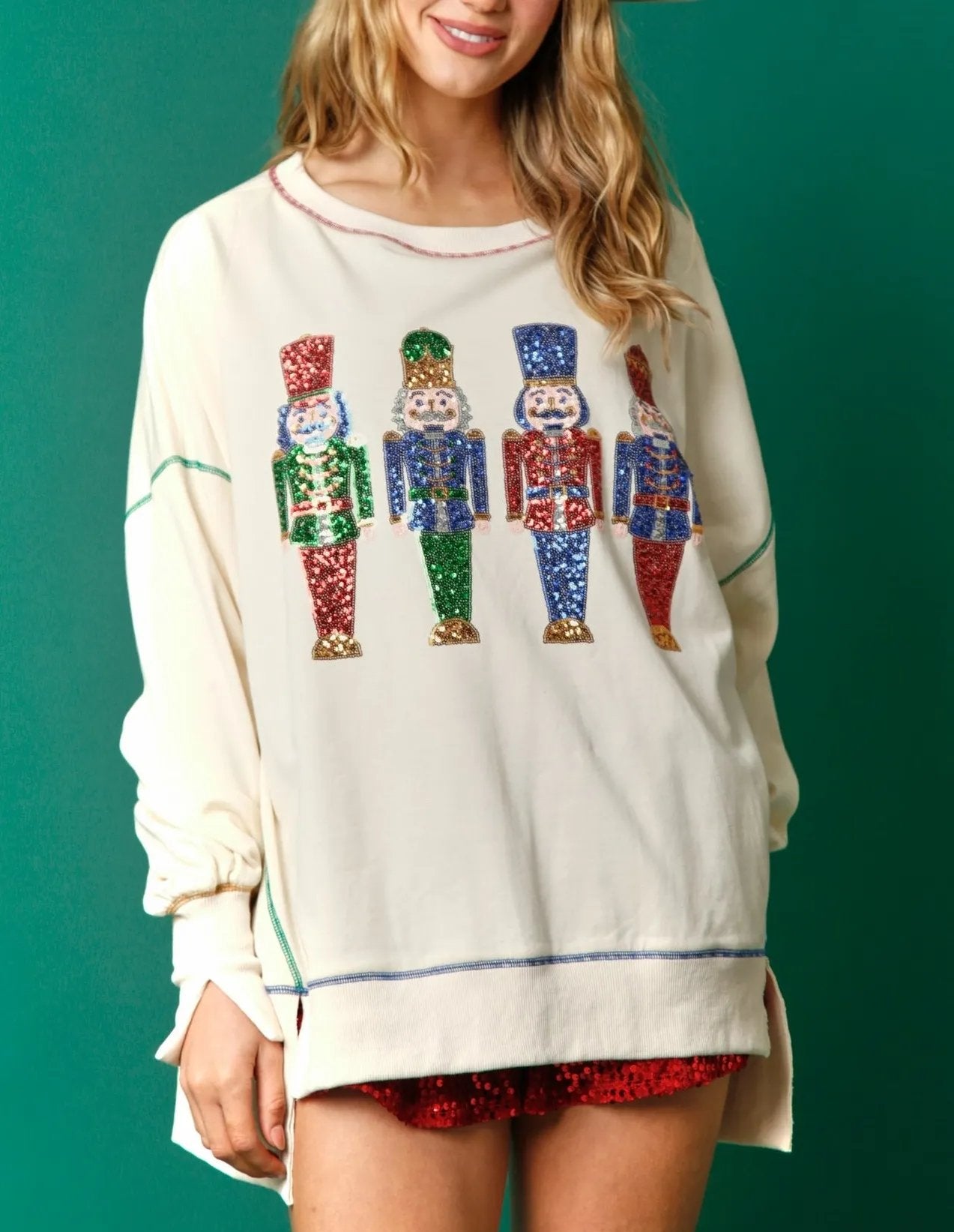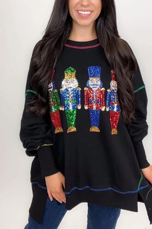 Bring some sparkle to your wardrobe during the holidays with this Christmas Sequin Nutcracker Sweatshirt. This unique design features gorgeous sequin nutcrackers, color block seam, long balloon sleeves, high-low hem, and a loose fit for maximum comfort. Are you ready to bring some joy to your closet this year?