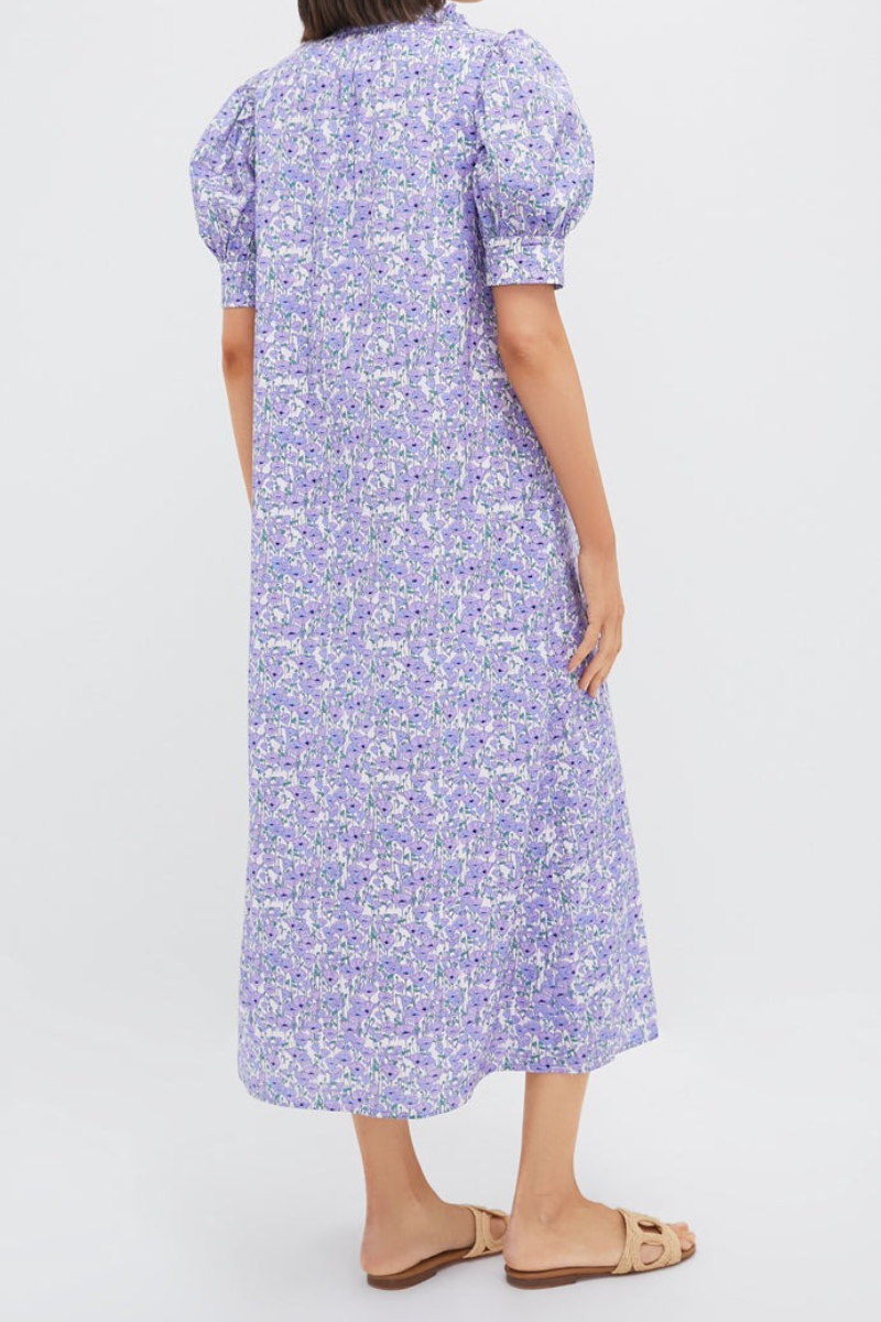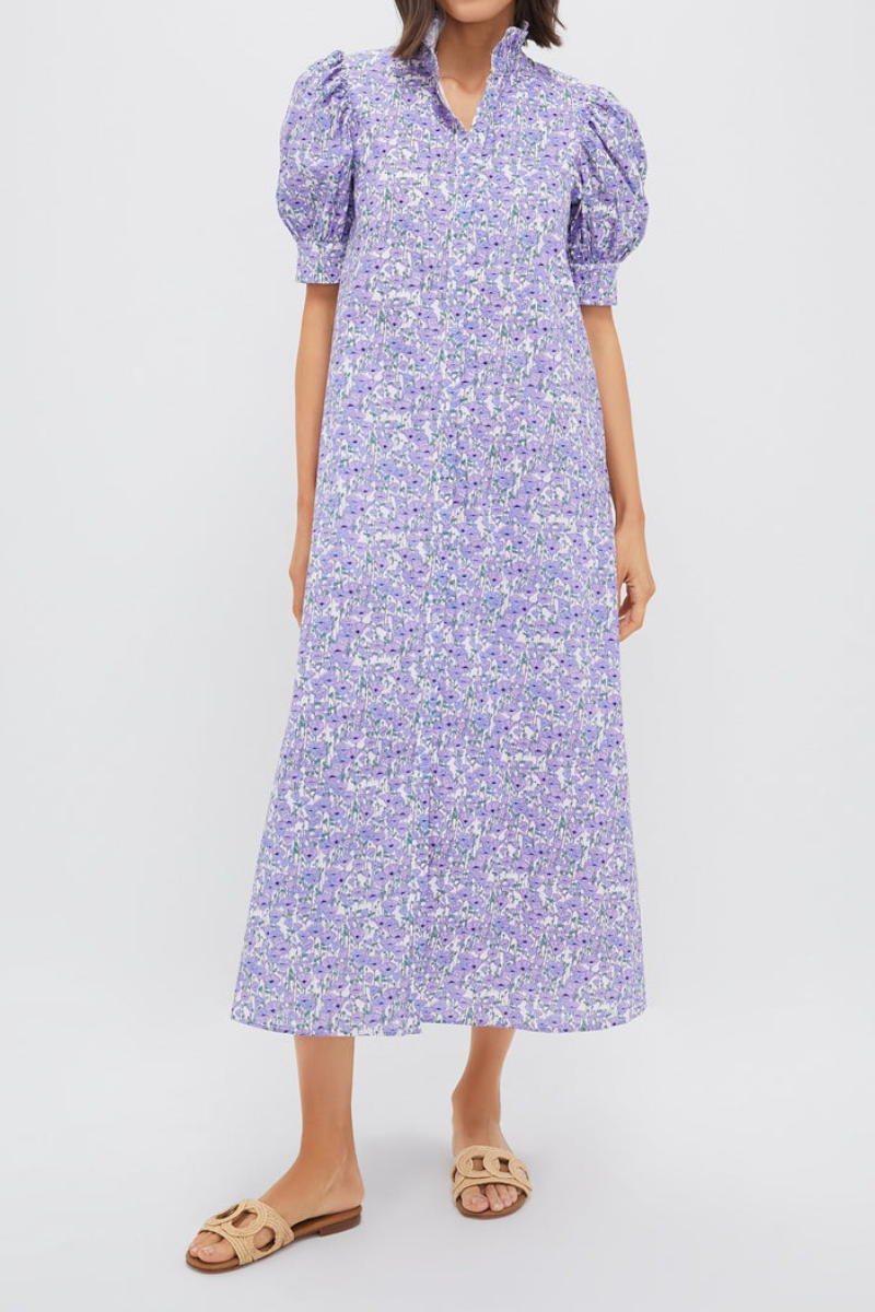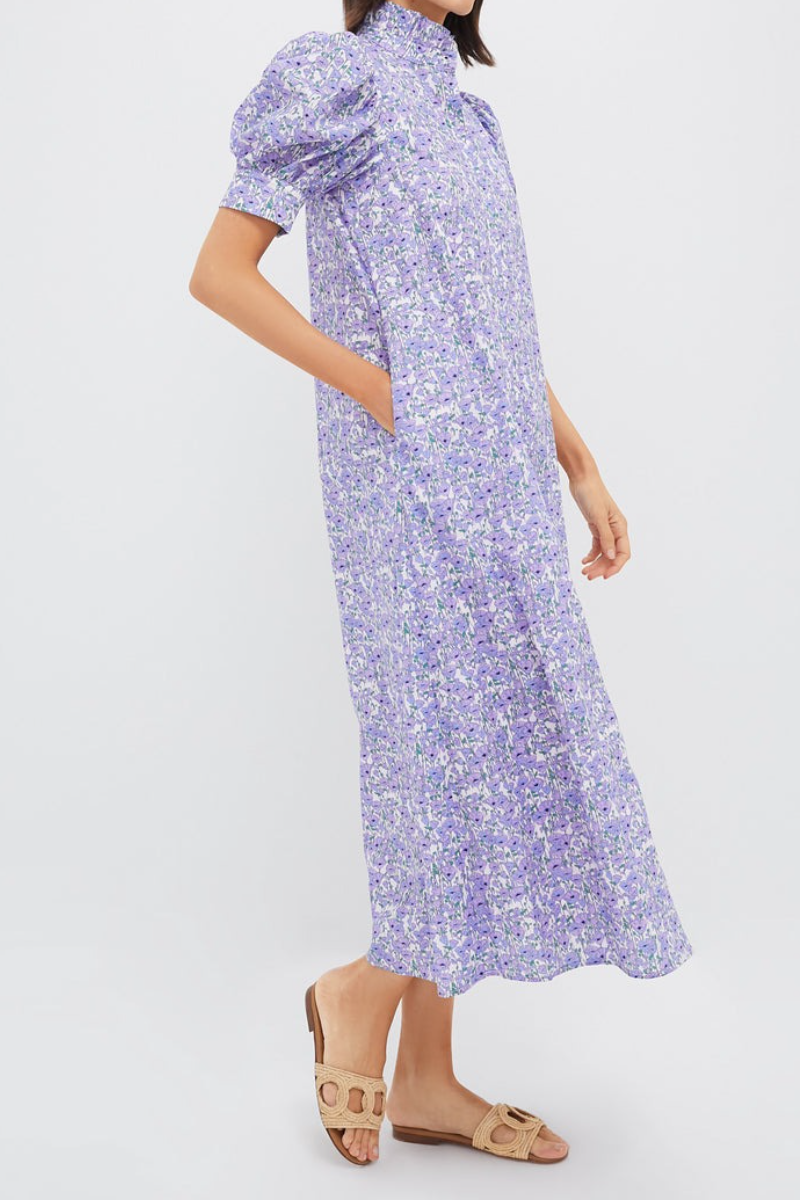 Sweet and chic, the Dress is a style we know you'll reach for time and time again. Perfect for resort wear, brunches, showers, and anything in between, the ways to style this maxi are endless. Featuring a feminine ruffle stand collar with short puff sleeves in an all-over ditsy purple floral print, this straight silhouette is easy to wear all day long. Pair with chunky heels and a sweater for a casual cool daytime look, or opt for easy sandals and a tote!