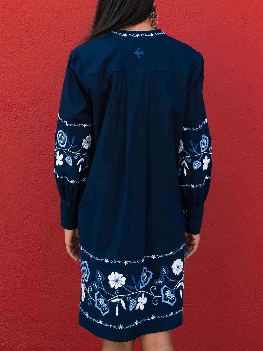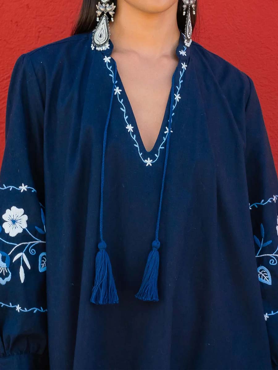 Elevate your style with our intricately hand-embroidered button-cuff long-sleeve dress. The v-neckline, adorned with charming tassels, adds a touch of bohemian elegance. Each dress showcases meticulous craftsmanship, featuring exquisite patterns that highlight exceptional artistry. Perfect for any occasion, this unique piece effortlessly combines timeless elegance with modern flair.