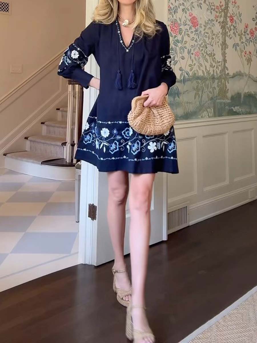 Embroidered V Neck Long Sleeve Dress
