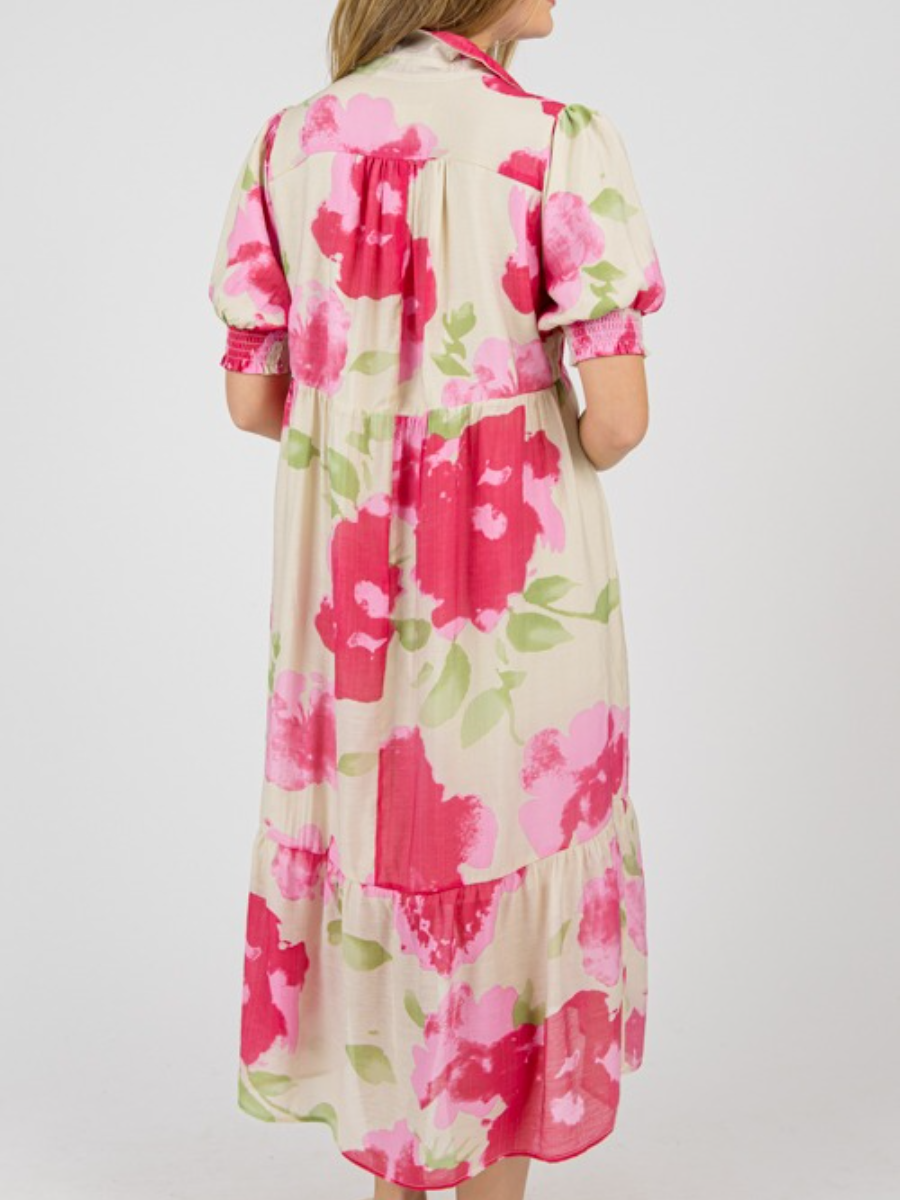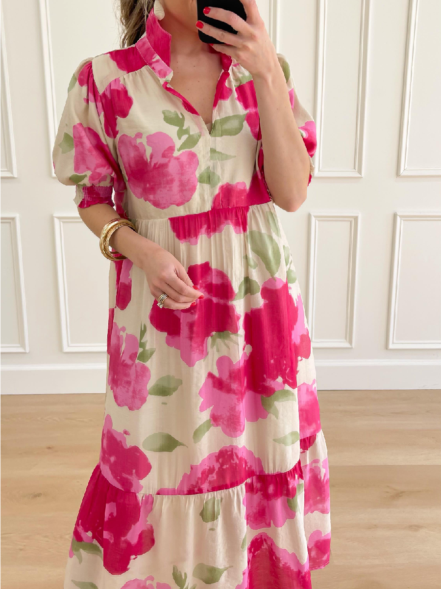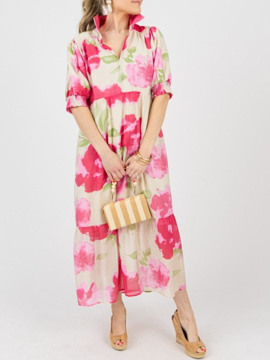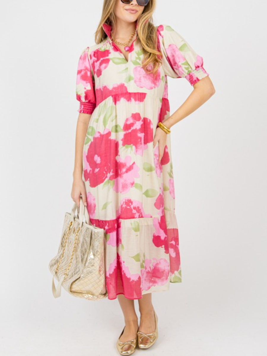 This maxi features cascading flowy tiers covered in a vibrant abstract floral print. A classic collar gives way to a V-neckline, and the short puff sleeves have a smocked cuff for a comfortable hold. As you can see here, it easily dresses up or down by simply changing your shoes!