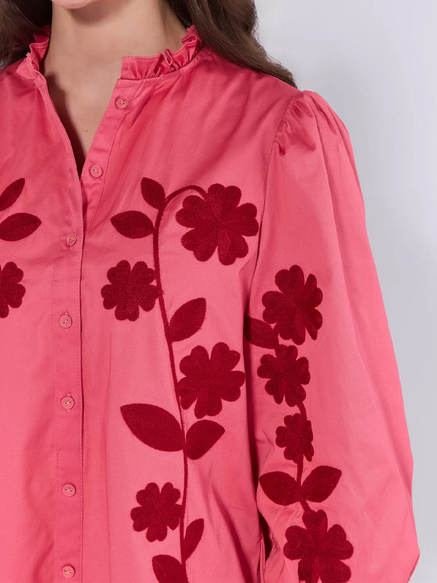 Floral Embroidery Band Collar Ruffle Trim Dress