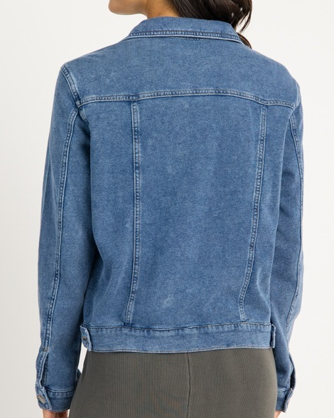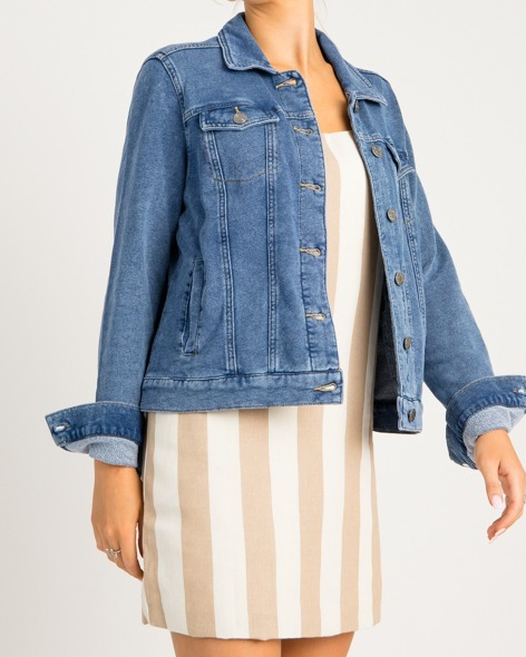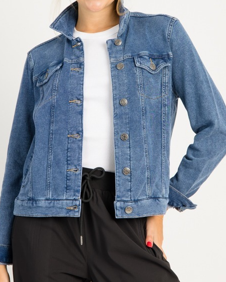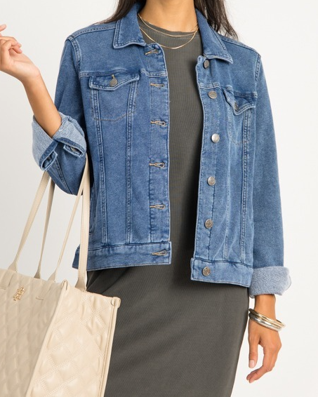 This incredible jacket gives you the timeless look of true denim, but with a secret twist – it's actually crafted from a super soft and comfortable knit fabric that feels like your favorite sweatshirt. That means ultimate stretch and zero stiffness, allowing for easy, all-day wear. It still has all the essential details you love: a classic collar, functional button front, convenient buttoned chest pockets, and handy side pockets. This jacket is truly the best of both worlds, blending classic style with unparalleled comfort!