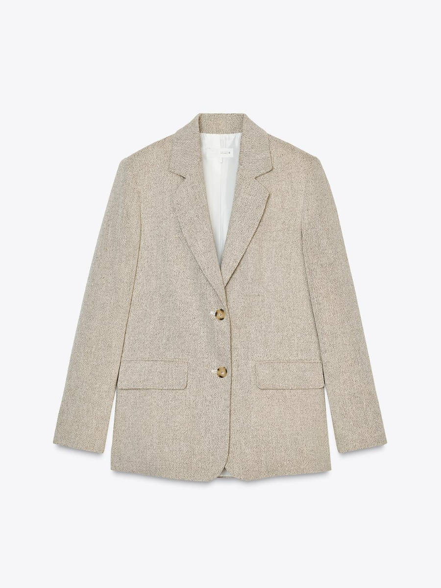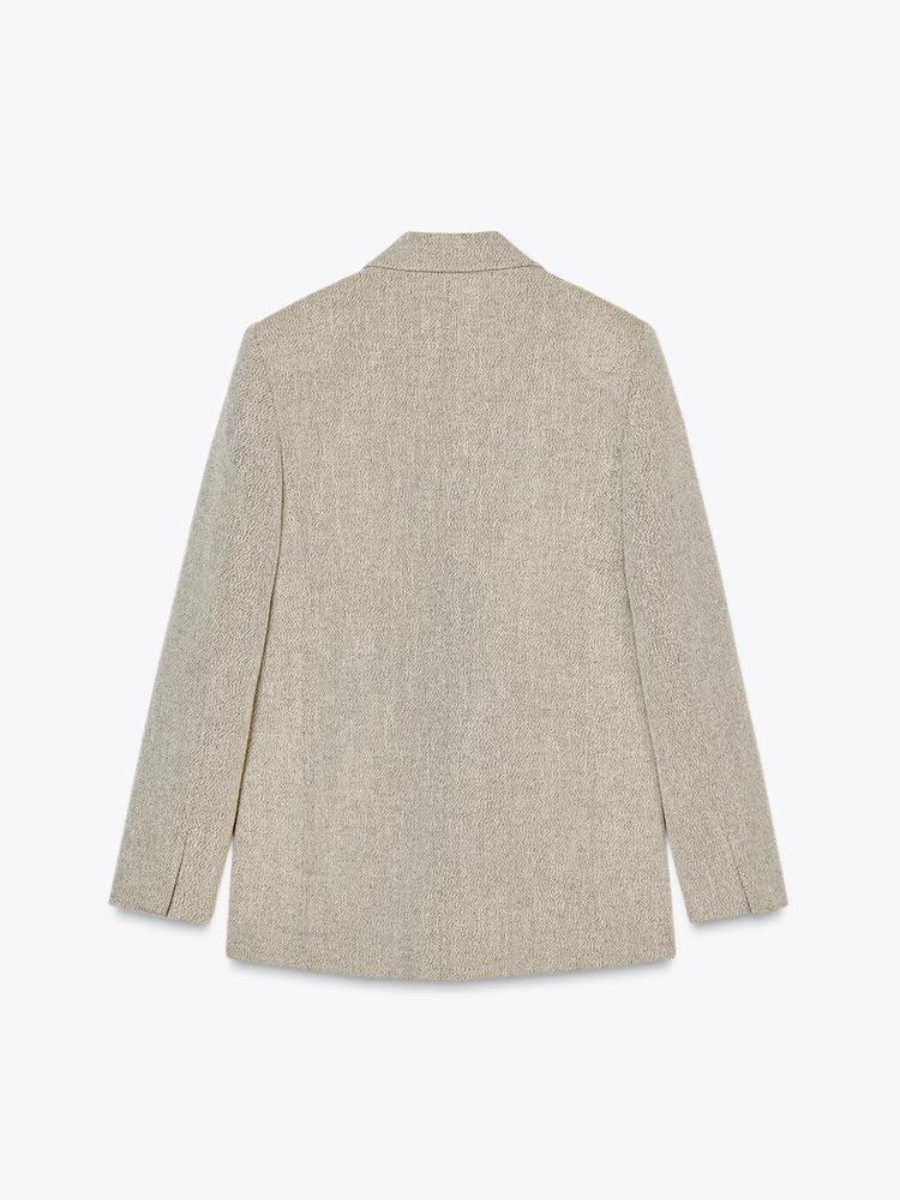 Jacket with lapel collar and long sleeves with shoulder pads. Front flap pockets. Front button closure.