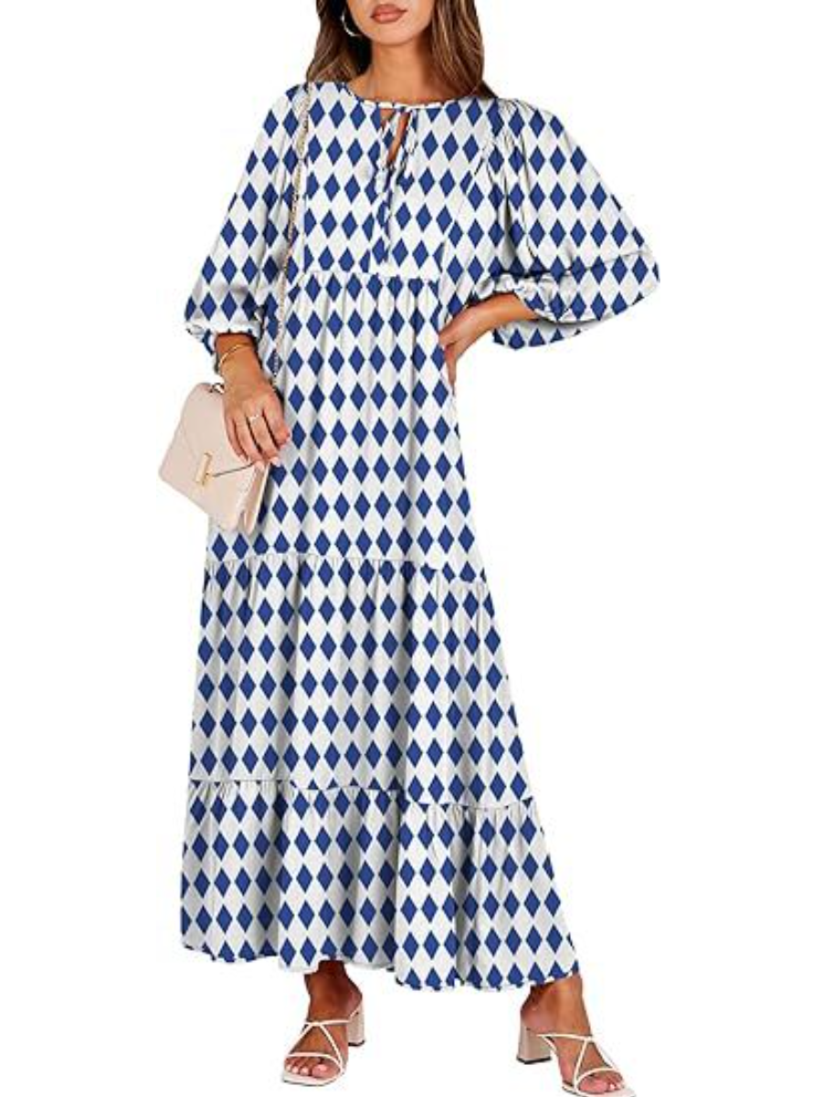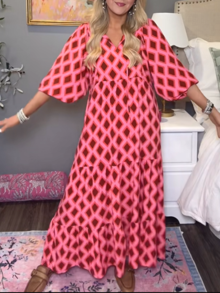 V-Neck Bubble Sleeve Casual Print A- Line Long Beach Dress